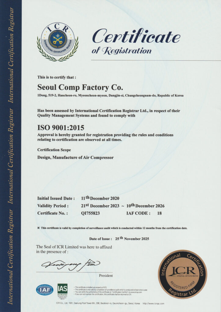 서울콤프팩토리는 ICR 인증(인증코드 QI755823)을 보유한 전문 제조·서비스 기업으로, 국제적으로 검증된 품질경영시스템을 적용하여 제품 설계, 생산, 설치 및 사후관리까지 모든 과정에서 안정적이고 신뢰할 수 있는 서비스 품질을 유지하고 있습니다.